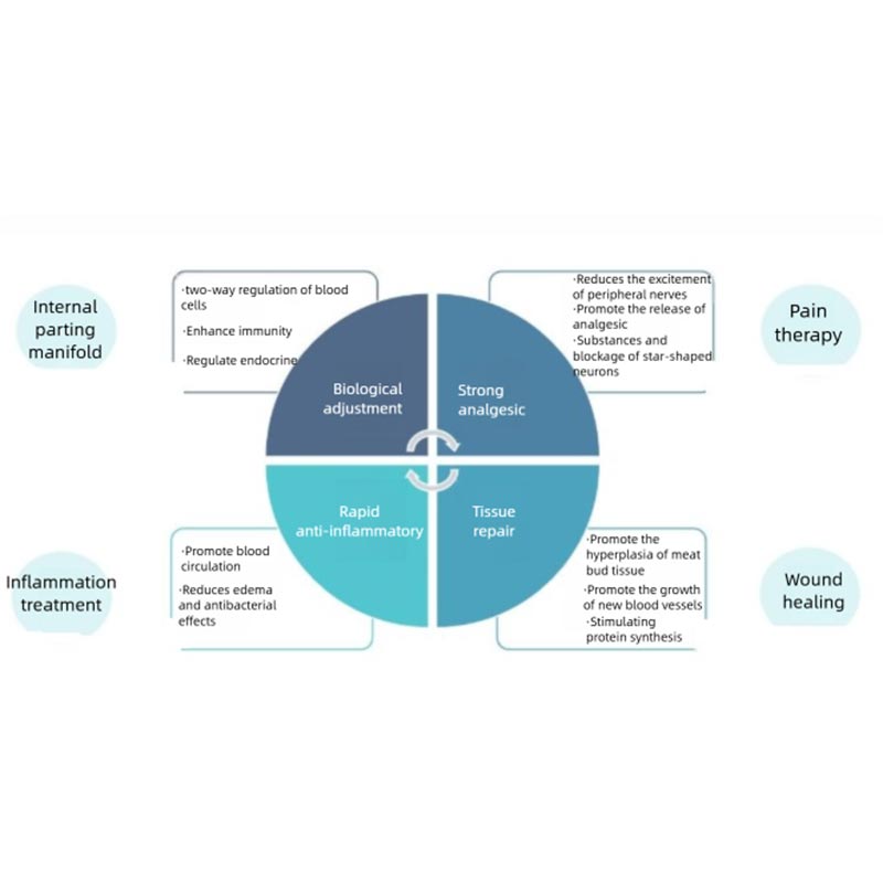 الليزر له تأثير جراثيم، يمكن أن يعزز الدورة الدموية، ويخفف من وذمة الأنسجة.